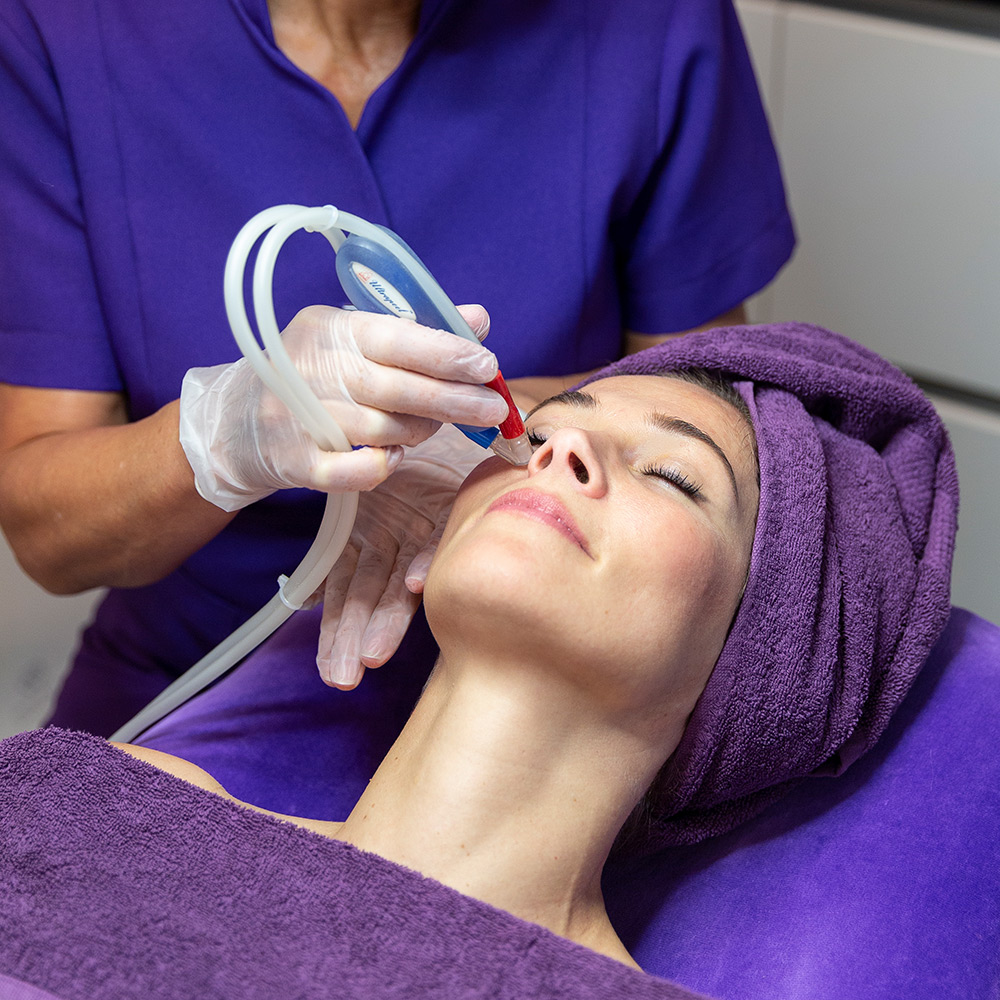 Een fijne straal met steriele kristallen wordt d.m.v. een vacuüm langs de huid gezogen waarbij de bovenste vervuilde, dode huidlagen van de opperhuid samen met de kristallen afgevoerd worden. De huid wordt diep gereinigd, glad gepolijst en krijgt een betere doorbloeding.